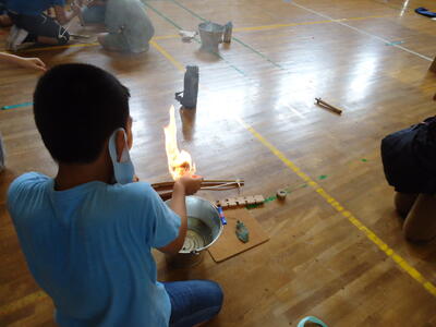 土器を見たりさわったり、石器で紙を切ったりしました。火おこし体験では、火をおこす大変さを実感しました。火がついたときは驚きと感動でした!\(^o^)/