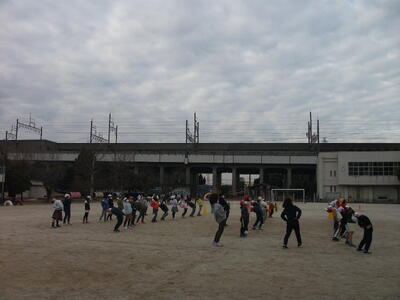 今日は低学年の朝運動の時間です。朝の時間を有効に使い、子どもたちの体力向上につなげていきたいと思います。今日は曇っていて、寒さも厳しいですが、1・2・3年生のみんなは元気いっぱいです。