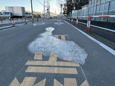 今日の朝は、冷え込みも厳しく、氷が張っているところも多かったのではないでしょうか。二俣小の前の道も凍っていました。11月4日から学校前の工事が開始され、狭くなっていた歩道ですが、簡易ガードレールが撤去されました。歩道は広くなりましたが、広がって歩かないように、改めて歩き方の指導をしていきたいと思います。