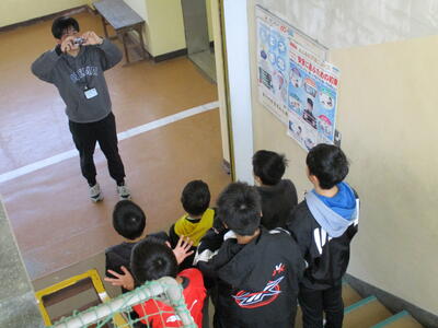 朝は、校舎の1階を学校探検です。「どんな教室があるかな?」「どんな先生がいるかな?」興味津々の眼差しです。実に静かに探検しています。