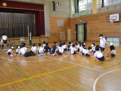 1年と6年は、3時間目に体育館で行いました。一番年齢差の大きな学年なので、6年の1年を見る目がとても優しく見えます。かわいくて仕方ないという感じです。名刺交換をした後は、「じゃんけん列車」で楽しみました。後ろについて誘導してあげる6年生。なかなか頼もしいです。ペアの子がじゃんけんに勝つと思い切りガッツポーズをして喜んでいました。一緒に楽しめました。