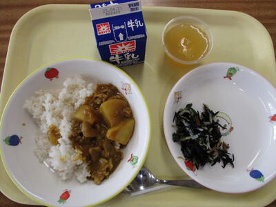 1年生は、今日から給食が始まります。給食当番も順番で行っていきます。初めての給食ですが、当番の子たちは上手に配膳し、ほかの子も静かに順番を待っています。「いただきます」で食べ始めます。今日のカレーはマイルドなので「辛いの苦手なんだよな~」と言っていた子でも大丈夫です。美味しそうに食べる顔をお見せできないのが残念です。たくさん食べて、元気に過ごしましょうね。