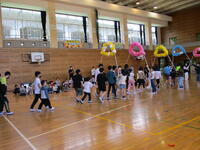 入場をむかえる花のアーチは5年生が担当です。入場のあとは、各学年の出し物で楽しみました。