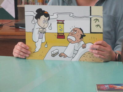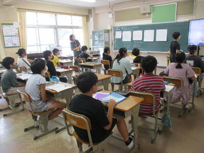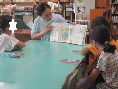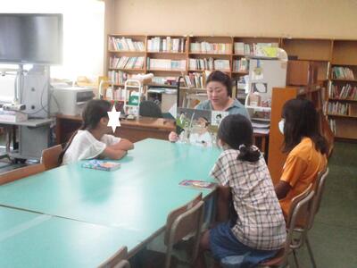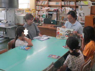 夏休み初日。今日は図書室の開放日となっています。それに合わせて、おはなしサークル「かみふうせん」の方々の読み聞かせを行いました。コロナ禍でしばらく中止していたので数年ぶりの開催です。