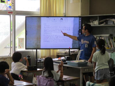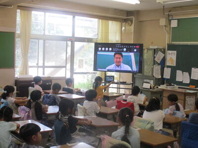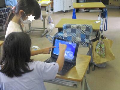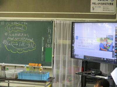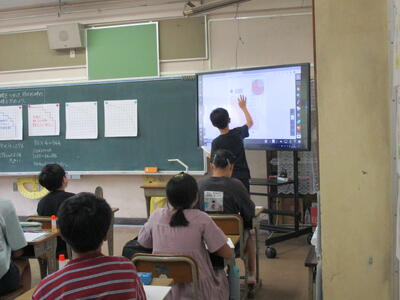 各教室には65インチの大型提示装置が導入されています。テレビとしての機能はもちろん、パソコンとつないで画面を共有したり、実物投影機をつないでノートを拡大したり、教科書を映して問題を提示したりするなどして活用しています。タッチ機能も付いているので、黒板の代わりに文字を書くことも可能です。視覚を生かす取り組みを考えていきたいと思います。