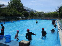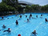 今日は、5.6年生が着衣泳を行いました。着衣泳は、普段の服を着たまま入水する水泳の授業です。 通常の水着での水泳の授業では体験できない「非常時」を体験することで、いざというときに落ち着いて対応できるようにするのが目的です。