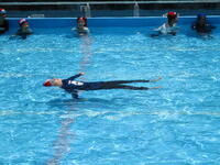 水に落ちてしまったら、「浮いて待つ」のが基本です。背浮き(上をむいて浮かぶ)の練習をしましたが、なかなか浮いていられません。こわがらず力を抜くことが大切です。ペットボトルを浮き袋として使って浮いてみると、今度は長い時間浮いていられる子が増えてきました。あごに当てたりおなかに抱えたり自分に合った場所を見つけました。服を着たままだと泳ぎづらいことも感じました。