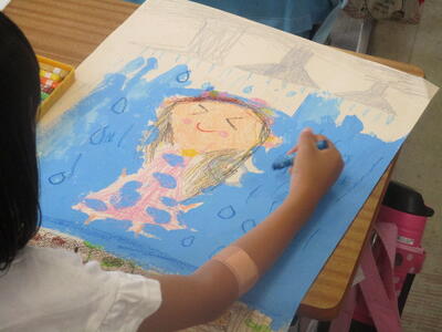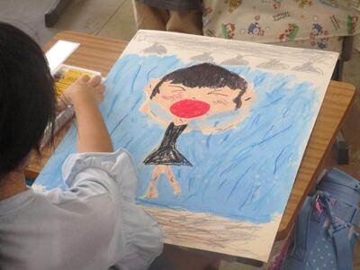 1年生は、プールでシャワーを浴びた時の様子を絵に描きました。シャワーの水の青がとても涼しげです。