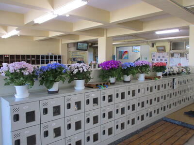 卒業式で飾った鉢植えも、入学式でも活躍してもらうために職員玄関で大事にお世話しています。