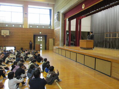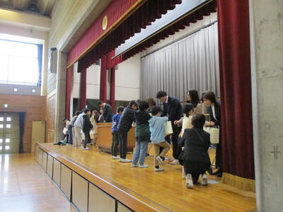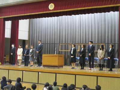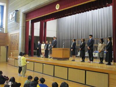 修了式に続いて、今年度末で二俣小を離れることになる10名の先生方とのお別れの式が行われました。長い先生は5年、短い先生は1年の勤務となりましたが、子どもたちにたくさん関わっていただきました。新天地でのご活躍をお祈りしています。ありがとうございました。異動先につきましては、メールにて送信いたしましたのでご確認ください。