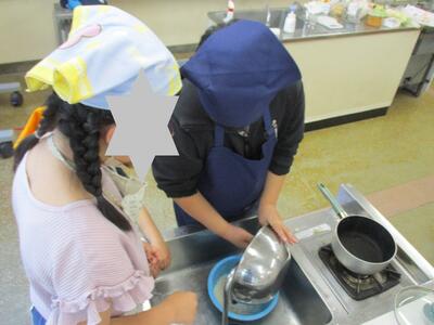 今日は、さくら学級がご飯とみそ汁の調理実習を行いました。器具の準備をする、お米をとぐ、煮干しのわたをとる、野菜を切る、湯を沸かす…。作業はたくさんありますが、みんなで協力して行うことができました。できたご飯とみそ汁は給食と一緒に食べました。ちょっと軟らかかったですが、全部食べました。「次は何を作ろうかな?」「誰を呼ぼうかな?」できることが増えるとやりたいことも広がります。おいしいご飯とみそ汁でした。ごちそうさまでした。
