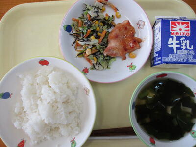 ごはん 照り焼きチキン 海と畑のサラダ 豆腐のすまし汁 牛乳