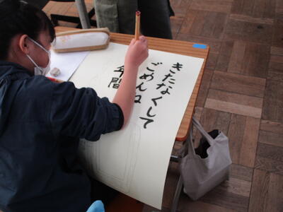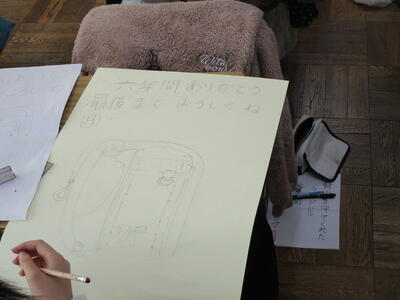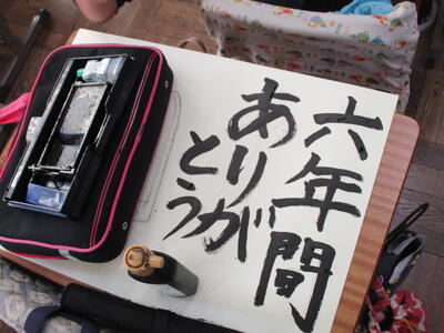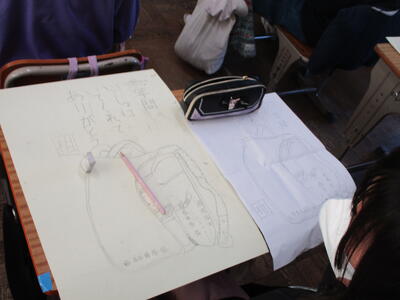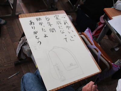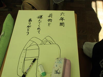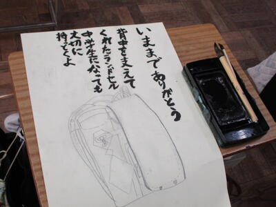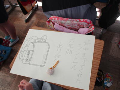 6年生がランドセルの絵を描いていました。6年間、毎日背負い登校した思い出のランドセル。そんな宝物のランドセルを見つめ真剣に取り組む6年生。きっと買ってもらった時の喜び、初めて背負って登校した日のこと、登下校での友達との思い出など、いろいろなことを思いだしているのでしょう。言葉は一人ひとり違いますが、みんな「感謝」や「労い」の言葉を書いています。仕上がりが楽しみです。