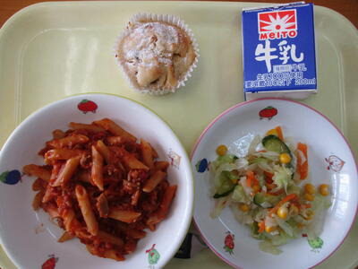 ペンネのミートソース コーンサラダ 手作りバナナケーキ 牛乳