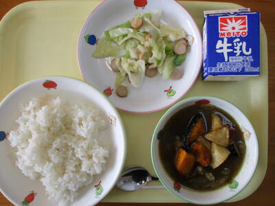 ごはん スープカレー キャベツとソーセージのソテー 牛乳