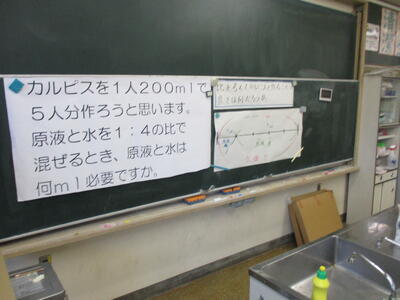 6年生は「比とその利用」の学習です。おいしいカルピスを作るには水とカルピスをどんな比で割ったらよいだろう?という学習問題です。おいしいカルピスを飲むためにいつも以上の集中力を見せた6年生でした!(^^)!