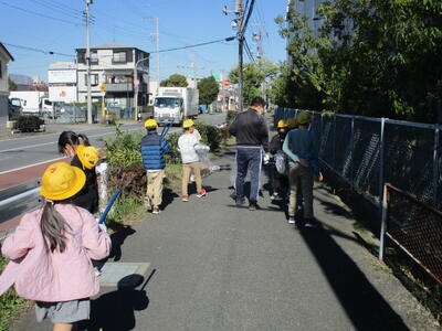 4年生:わが町未来探求科の学習でこの地域の学習をしています。この地域はごみが多いとわかり、少しでもきれいになるようにごみ拾いをしました。今日は2回目のごみ拾いです。学校周辺~二俣交差点までをきれいにしました。