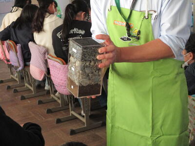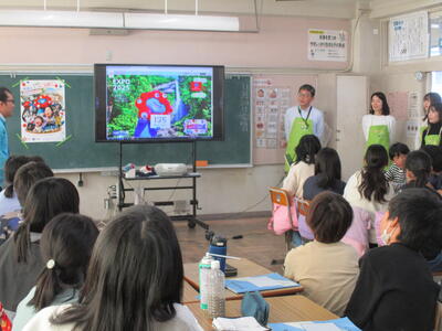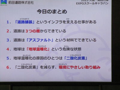 6年生:キャリア教育の一環として、前田道路株式会社の方々にお越しいただき、二酸化炭素を減らす取り組みについてお話していただきました。スポーツ選手やショップ店員等だけでなく、道路を作る仕事もあり、みんなの生活を支えていることがわかりました。たくさんの仕事に目をむけていけるといいですね。
