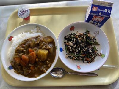チキンカレー ひじきのマリネ 一口ぶどうゼリー 牛乳