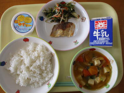 ごはん 白身魚のゆずみそ焼き 胡麻和えカボチャのみそ汁 ゆずゼリー 牛乳
