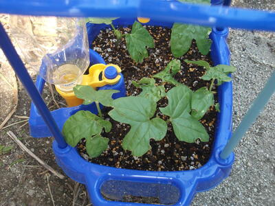 1年生は双葉のでたアサガオに水をあげています。あと一か月もすれば花が咲きます。しっかり育てて来年の1年生のためにたくさん種を集めましょう。
