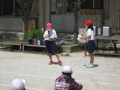 4時間目は3・4年生が校庭で集会を行いました。まずは、名刺交換をして自己紹介です。