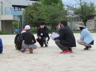 運動会の練習が始まっています。転んで大きなケガをしないように校庭の石を拾っています。