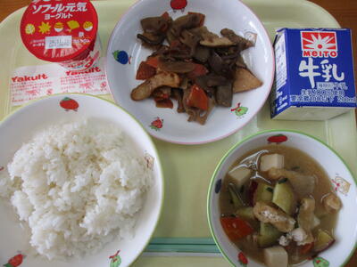 ごはん 五目きんぴら サツマイモのみそ汁 ヨーグルト 牛乳