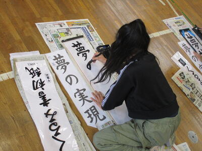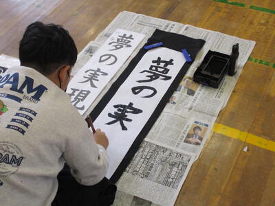 今日は、5・6年生が地域の方を講師にお招きして、書初めの練習を行いました。さすが高学年、準備も手際が良く、短時間で行っています。