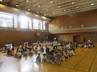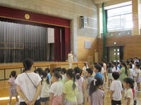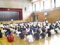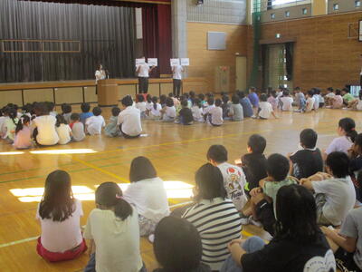 40日余りの夏休みが終わりました。夏休み明け初日なので、体育館で朝会を行いました。まずは校歌です。校長先生からは、夏休み明けもしっかりと目標をもって生活しましょう、生活のリズムを早く元に戻しましょうという話がありました。生活目標についての話では、「気持ちのよいあいさつをしよう」という目標に合わせ、「あ」相手を見て、「い」いつでも、「さ」先に、「つ」続けて あいさつができるようにしていきましょう、という話でした。いつも心がけていられるといいですね。