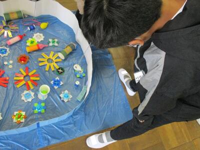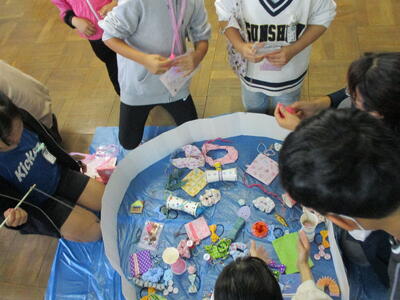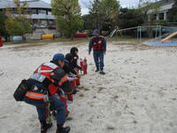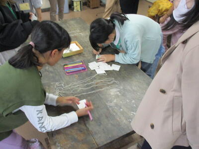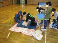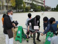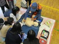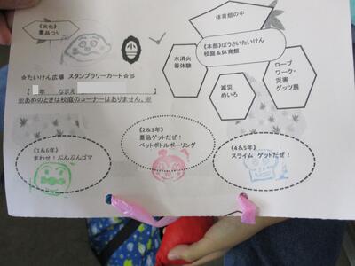 午後は、みんなが楽しみに待っていた「二俣たいけん広場」が開催されました。校庭と体育館では、市川消防署、(株)三和にご協力いただき、防災体験を実施しました。消防車の実物を見たり、消火器の使い方や通報訓練、AEDの使い方や心肺蘇生について消防署の方に教えていただきました。三和の方には、減災迷路、防災グッズ、ひもの結び方を体験させていただきました。どれも知識としては知っておきたいけれど、実際には体験したくないものばかりです…