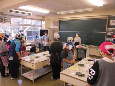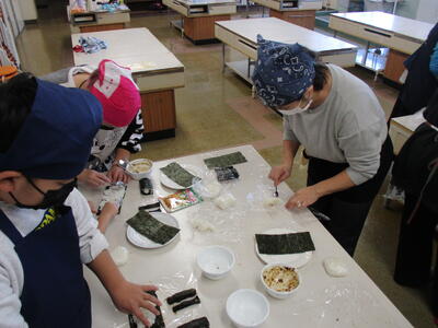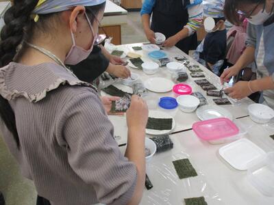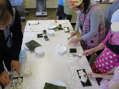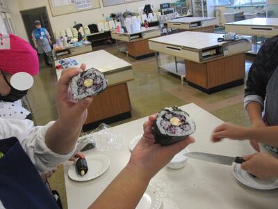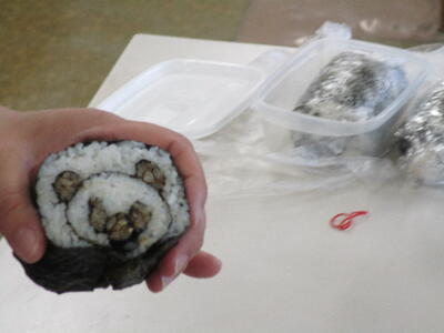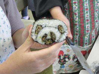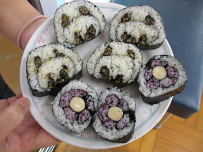 今日、さくら学級のみんなは、「祭り寿司」づくりを体験しました。講師は地域の方です。出来上がりの形をイメージしながら巻きずしの中の部品を作り、組み立てていきます。中の仕上がりは、切ってみないとわかりません。今日は、「パンダ」と「花」をテーマに作りました。満足度はどれくらいかな?