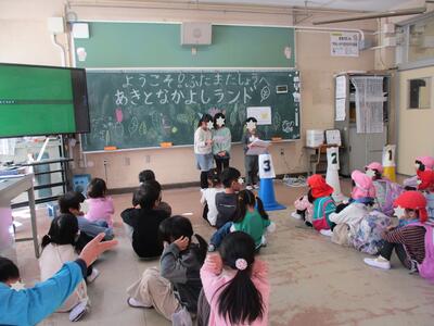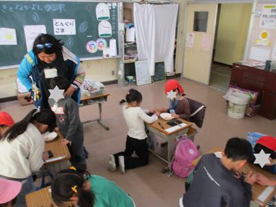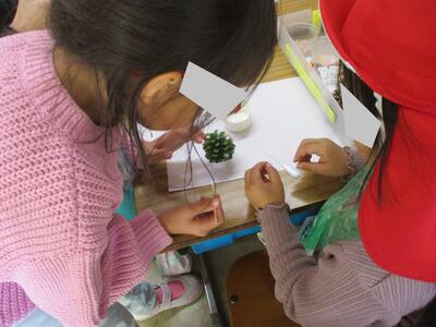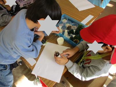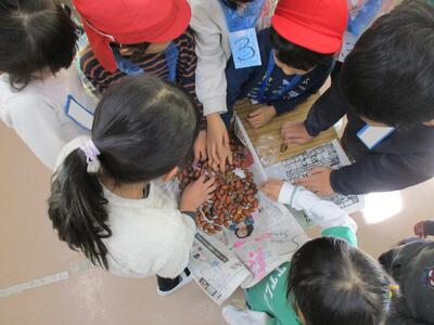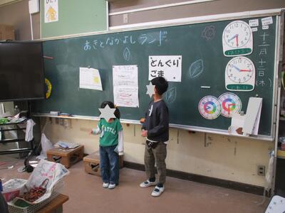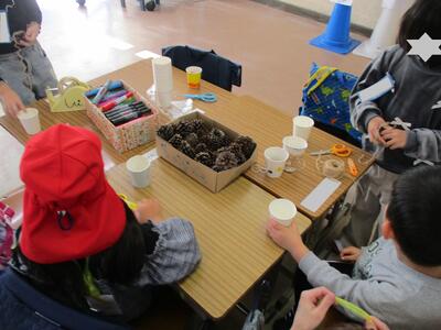 今日、1年生とさくら1組は、近所の幼稚園・保育園の園児さんを招いて「あきとなかよしランド」を開催しました。木の実を使っておもちゃを作ります。園児をお迎えするのに緊張感いっぱいの一年生。ドキドキが伝わります。自分たちが作り方を教わったおもちゃの作り方を園児のみなさんにやさしく教えてあげていました。とてもステキなお兄さん、お姉さんでした。4月に2年生になって、新しい1年生を迎える準備ができましたね。2月にも「昔の遊び」で交流をする予定です。今から楽しみです。