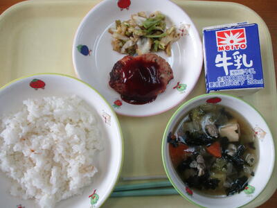 ごはん ひじき入り豆腐ハンバーグ キャベツとコンブ炒め 白菜スープ 牛乳