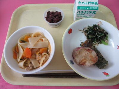 本日の献立は、ほうとう・ちくわの磯辺揚げ・さつまいも天ぷら・磯和え・白玉あずき・牛乳です。