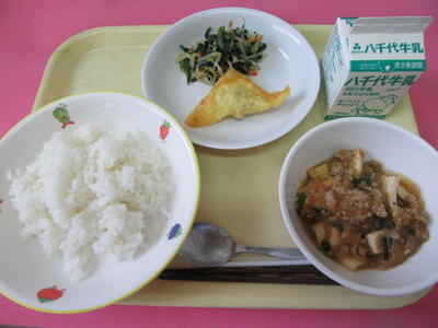 本日の献立は、ご飯・揚げワンタン・ナムル・生揚げ入りマーボー春雨・牛乳です。
