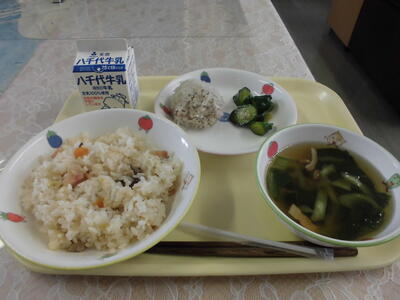 赤飯、鶏肉の照り焼き、いそか和え、すまし汁、イチゴゼリー、牛乳です。