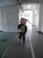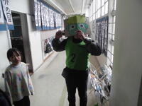 24人の鬼の中に、1人だけ「鬼に変えられてしまった福の神」がいるのでその「福の神」を、交流学年のペアで探しました。金棒、上着、リコーダー等様々なアイテムを手にした鬼がいて、その中から「福の神」を探し出すのに苦労していました。