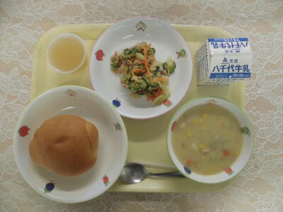 今日の献立は、バターロール、米粉豆乳コーンシチュー、焼き肉サラダ、手作りももゼリー、牛乳です。