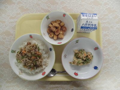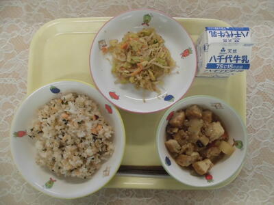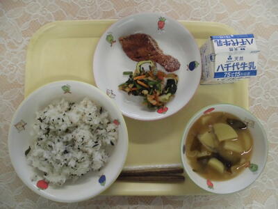今日の献立は、鮭わかめご飯、生揚げの肉味噌煮、ごま和え、牛乳です。