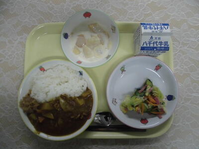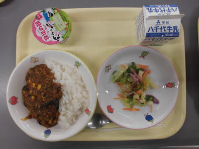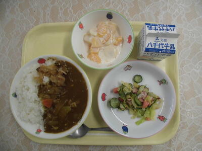 今日の献立は、コーンドライカレーライス、サラミサラダ、ヨーグルト、牛乳でした。
