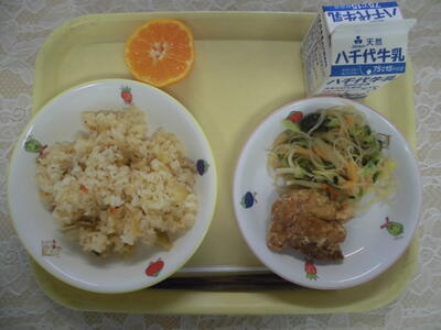 今日の献立は、キムチごはん、鶏肉のから揚げ、春雨サラダ、花みかん、牛乳です。
