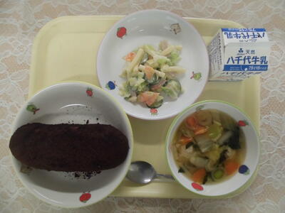 今日の献立は、ココア揚げパン、マカロニサラダ、鶏団子汁、牛乳です。