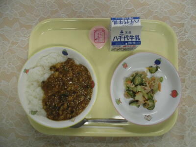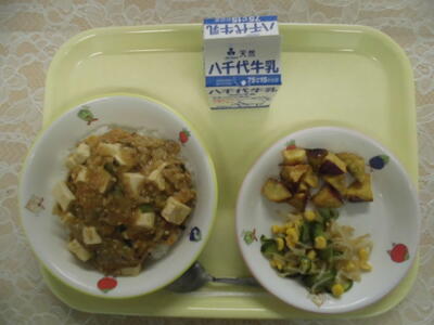 今日の献立は、マーボー丼、中華和え、大学芋、牛乳です。