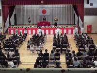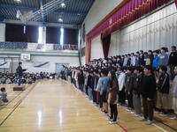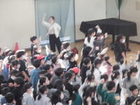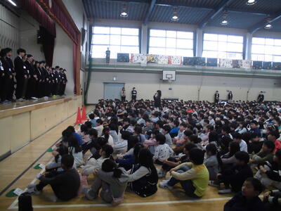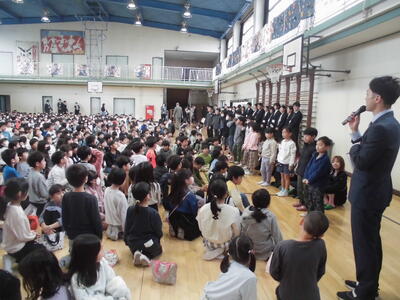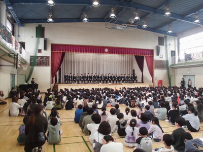 全校で校歌斉唱です。朝会の時よりも大きい声で、1年生に校歌を伝えようという思いを感じました。
