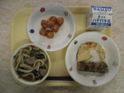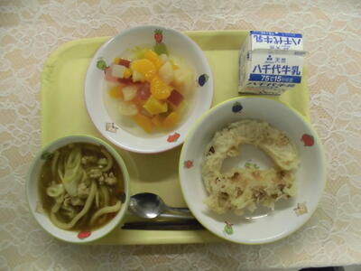 今日の献立は、カレーうどん、天ぷら(ちくわ、かぼちゃ)、フルーツポンチ、牛乳です。