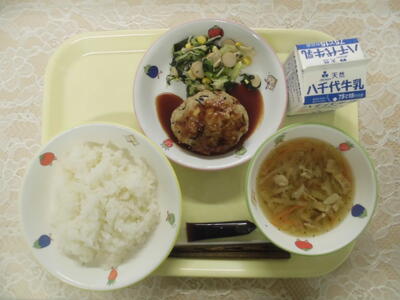 今日の献立は、ひじきチーズハンバーグ、ほうれん草とえのきのソテー、ジュリアンスープ、ごはん、ミルメーク、牛乳です。