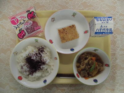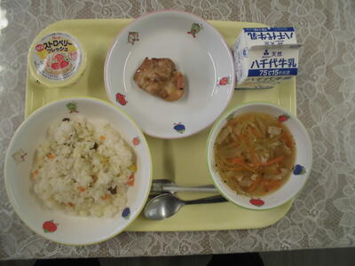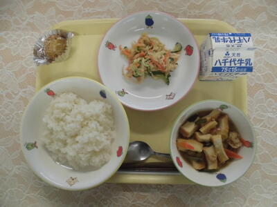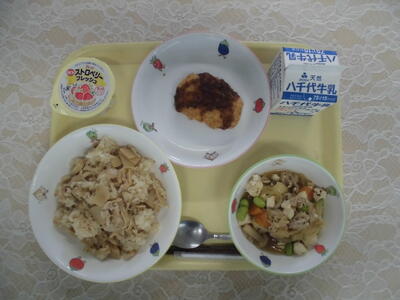 今日の献立は、たけのこご飯、おからコロッケ、肉豆腐、いちごゼリー、牛乳です。