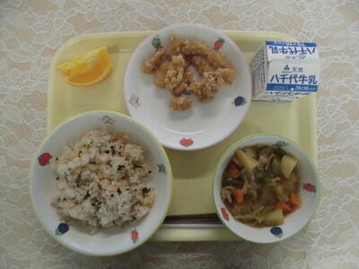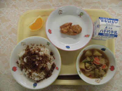 今日の献立は、おかかふりかけごはん、タンドリーチキン、肉じゃが、オレンジ、牛乳です。