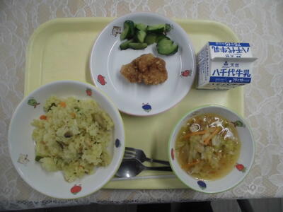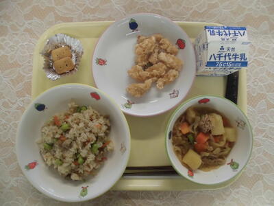 今日の献立は、カレーピラフ、鶏のから揚げ、フレンチきゅうり、ジュリアンスープ、牛乳です。